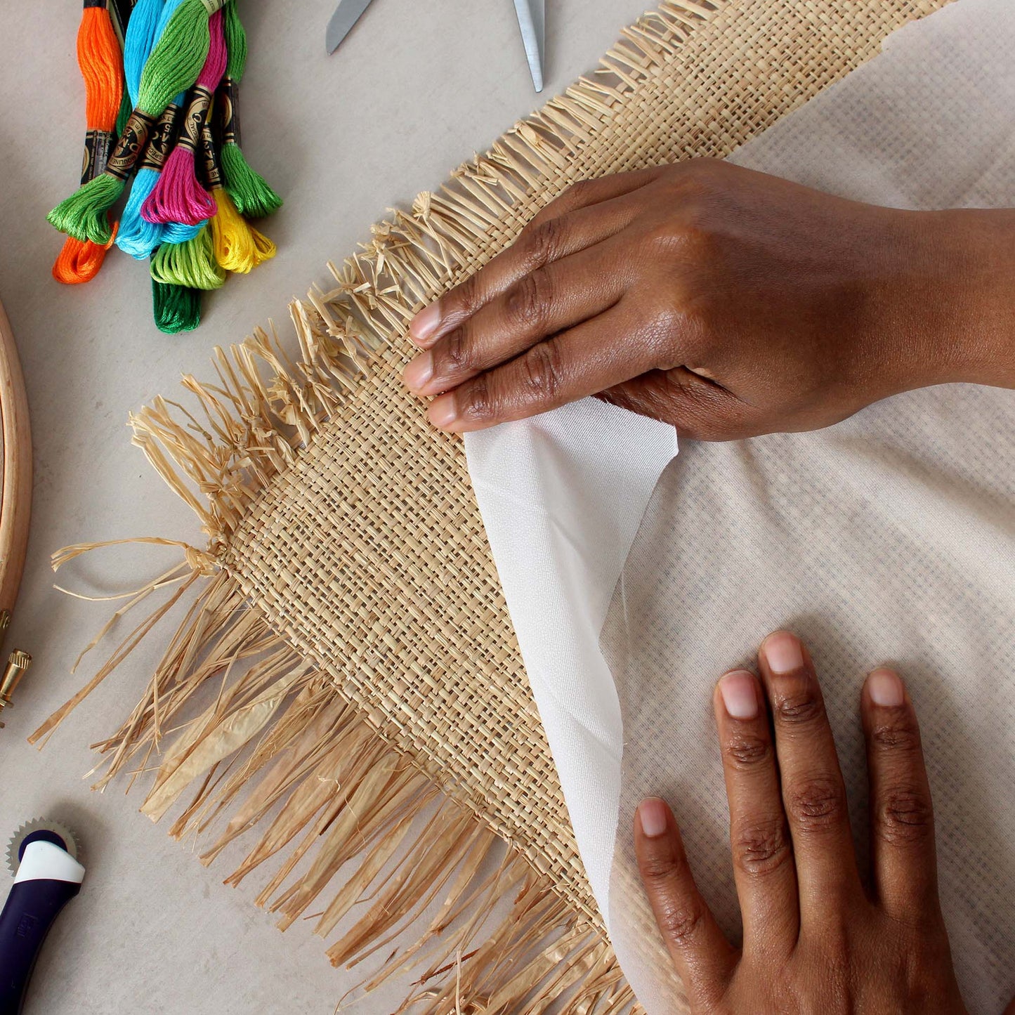 A lightweight, bi-elastic fusible interlining made from fine polyamide yarn. With a soft hand feel, this interlining is ideal for stabilising natural raffia fabric in raffia embroidery, providing gentle structure without compromising flexibility.