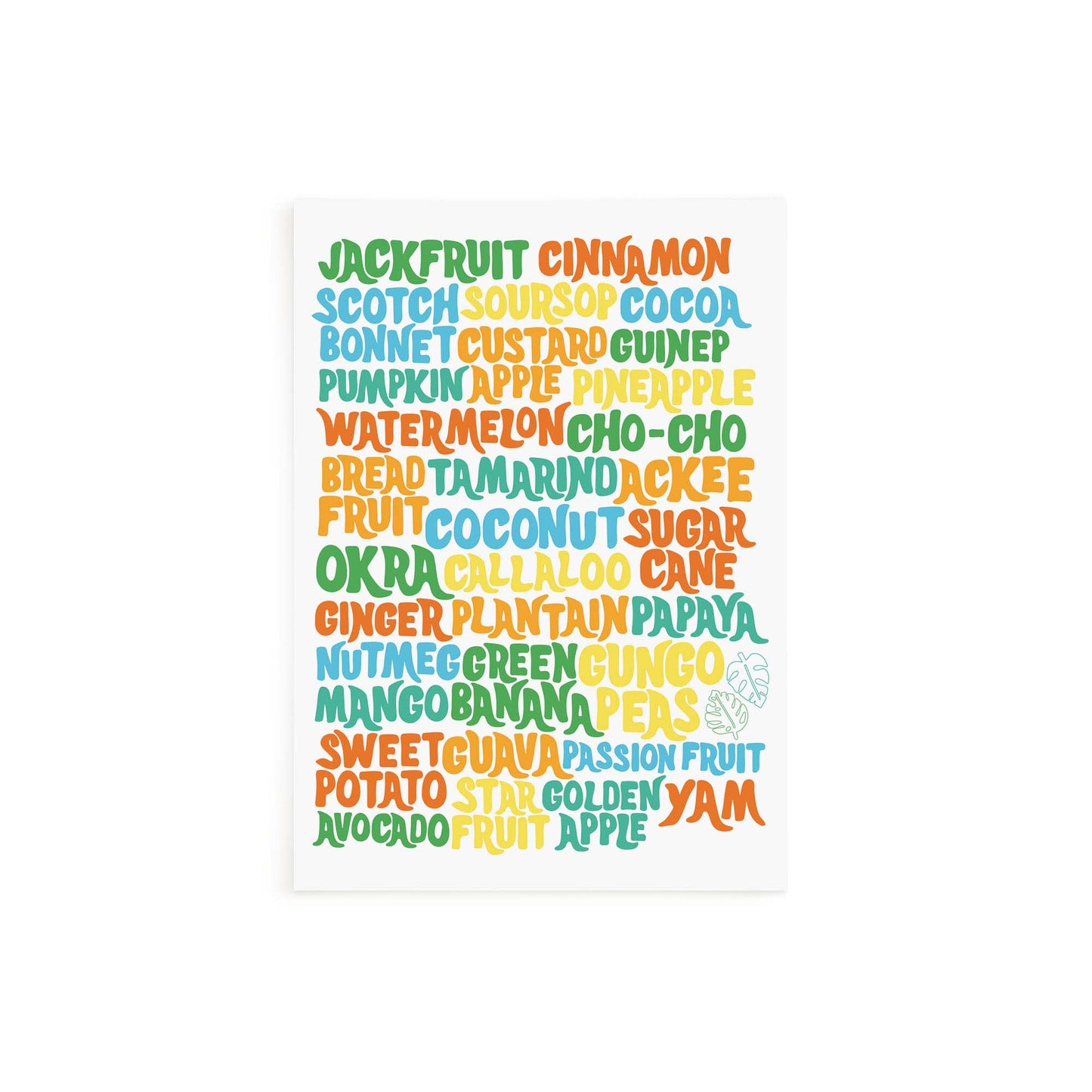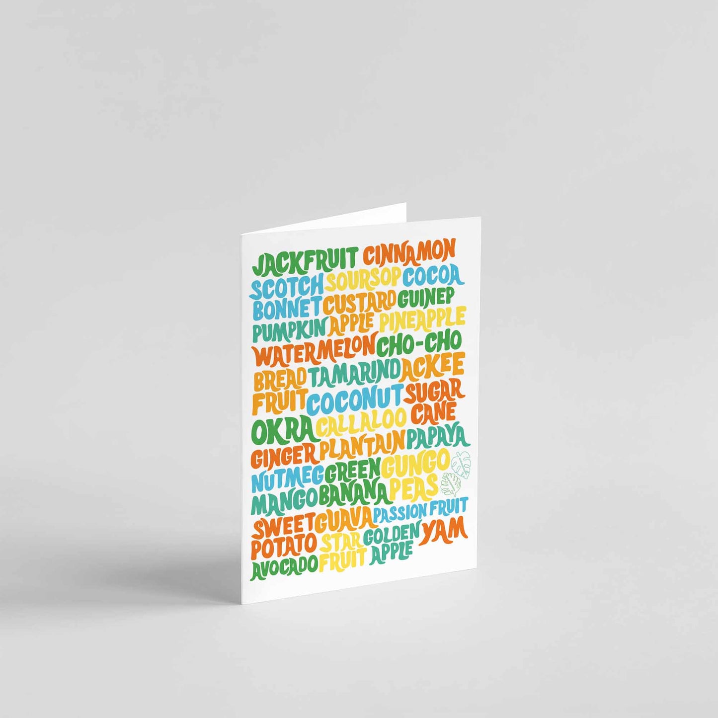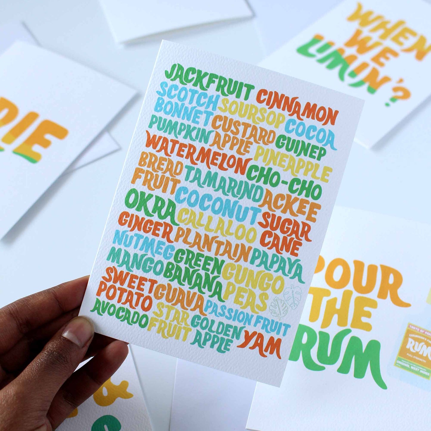 Celebrating all the food that abundantly grows on the Caribbean islands. A ‘just because’ card for those that love the Caribbean and it’s food from coconut and nutmeg to yam and ackee.