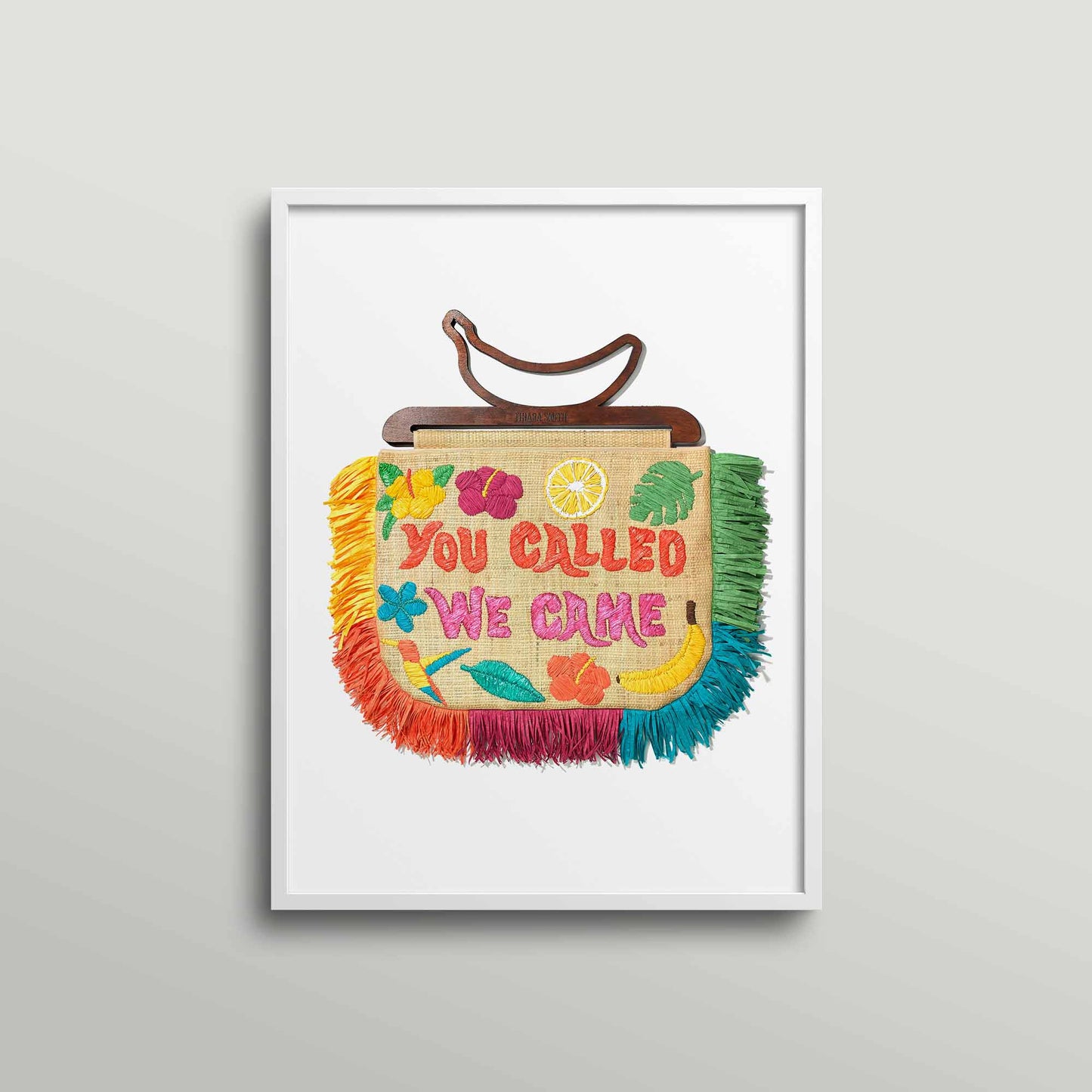 Own a piece of the Windrush Collection with this vibrant print, featuring the You Called We Came Raffia Embroidered Bag. The hand-embroidered raffia bag was designed and handmade by Tihara Smith as part of the Windrush Collection. Printed on premium quality fine art paper, this fine art print is stamped and signed by Tihara Smith.