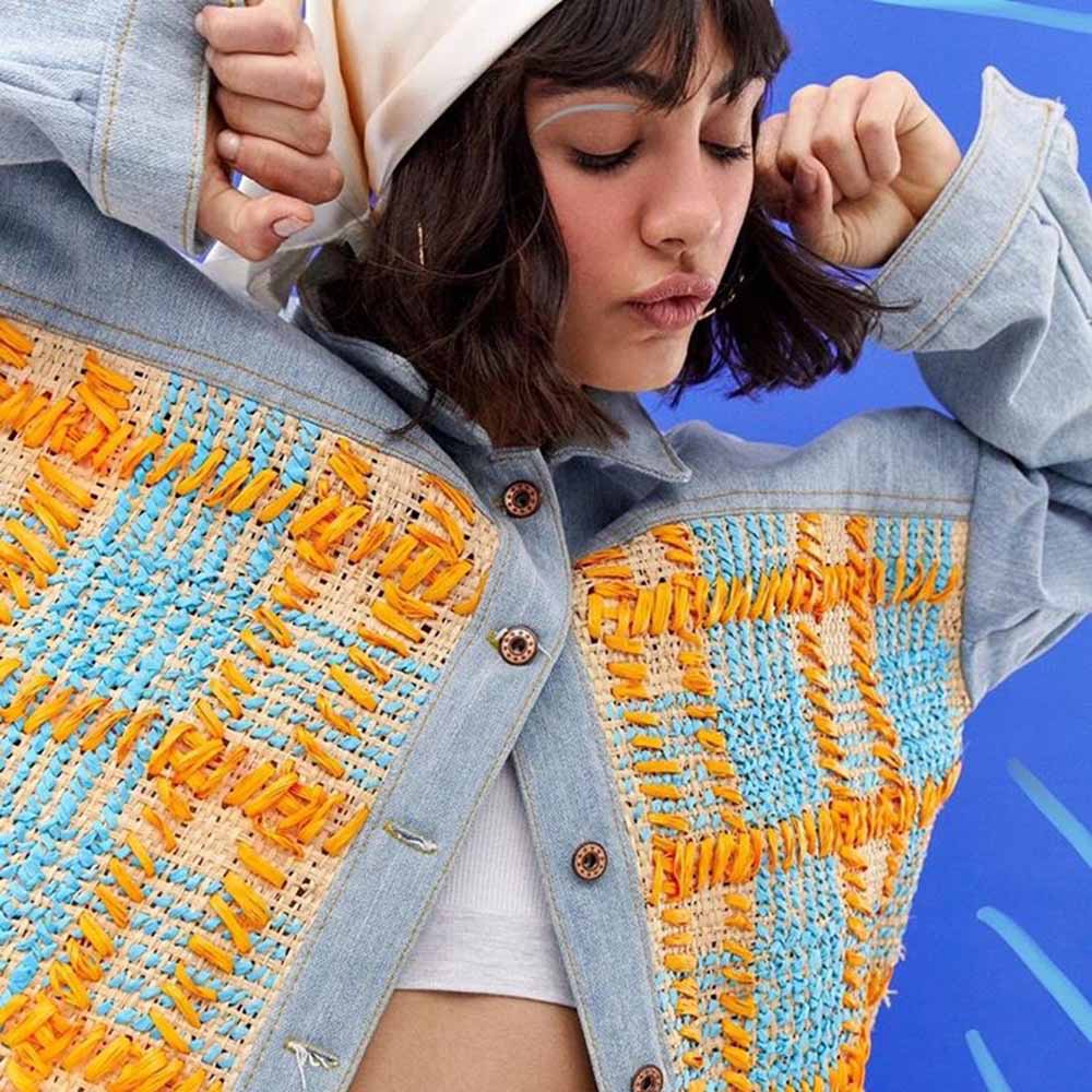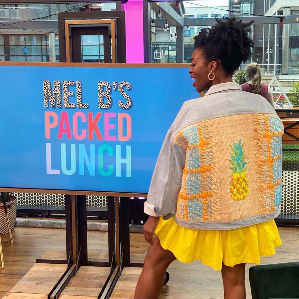 Presenter Sabrina Grant, styled by Rebecca Roy, wore the denim jacket from the Windrush Collection on Channel 4's Packed Lunch.