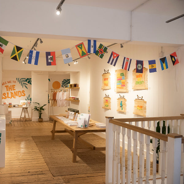 We hung Caribbean flags in our store in Seven Dials to celebrate Notting Hill Carnival weekend. We loved the flags so much that we kept them up for the rest of our time in the pop-up shop. Many people came in specifically because they saw their flag represented in Central London. It was special to be able to highlight the Caribbean islands in this way, as they are often overlooked.