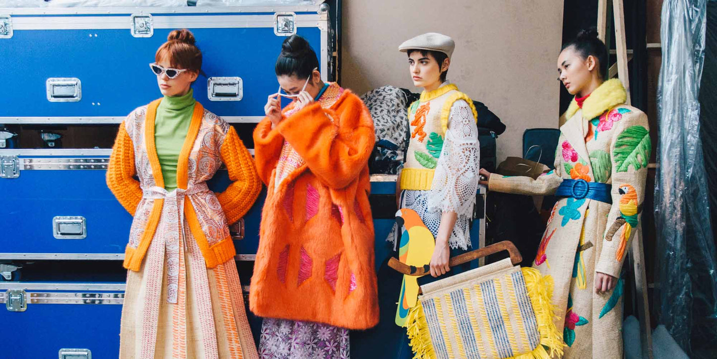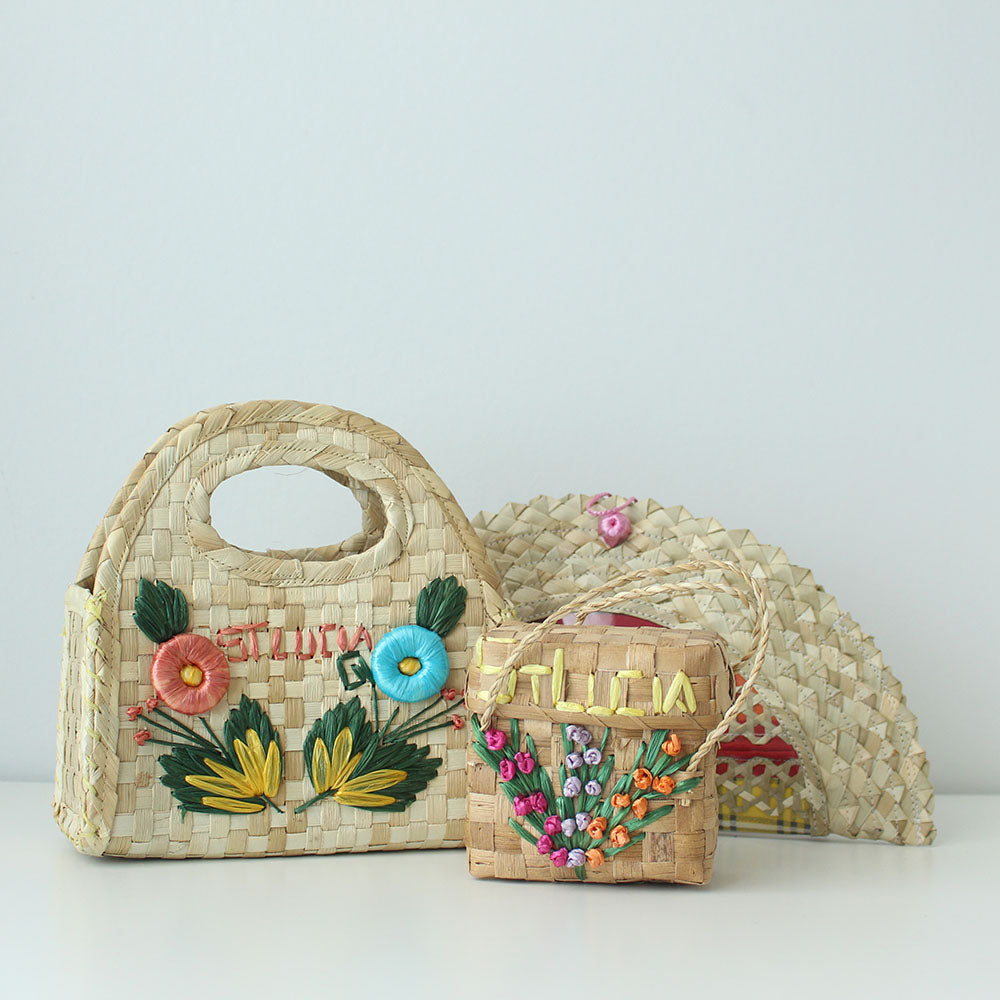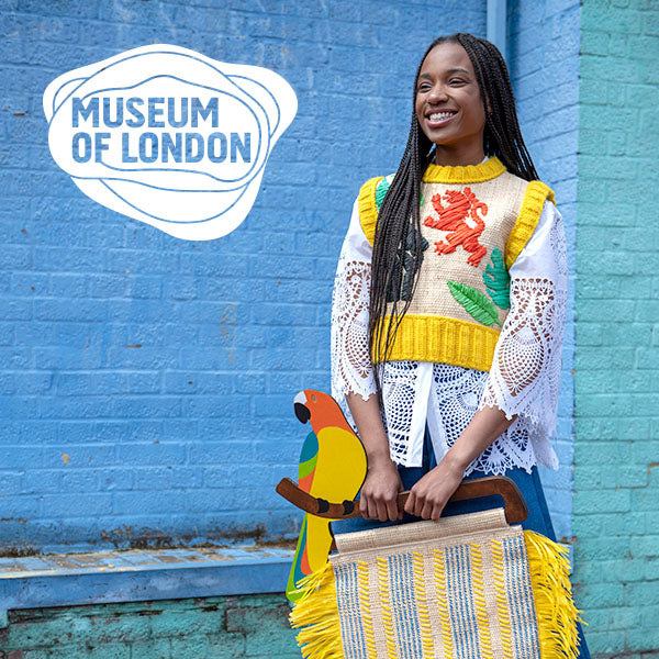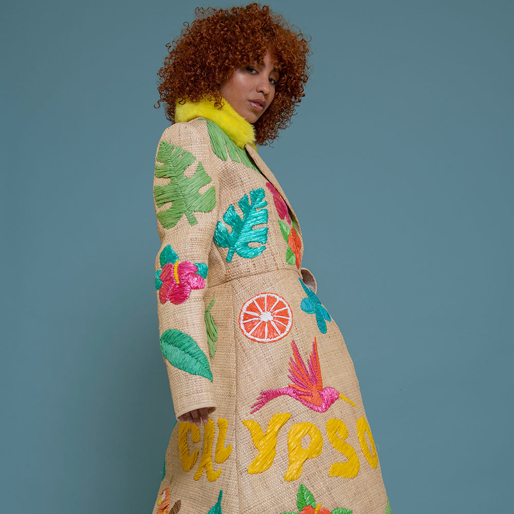 Just like the ‘West Indian Front Room’, this collection pulls together a combination of colours, textures and patterns. Raffia is one of the main materials of the collection, inspired by the woven straw crafts from the Caribbean, often used to make bags and hats. Along with raffia, vinyl tablecloths are mixed with faux furs and knits, taken from the ‘West Indian Front Room’ decor and the fashions worn by the Windrush Generation seen the the research photography by Neil Kenlock, Raphael Albert and Colin Jones, as well as family photographs. A bright and vibrant colour palette was used taking inspiration from the colours of Caribbean houses, as well as the diverse nature of the Caribbean.